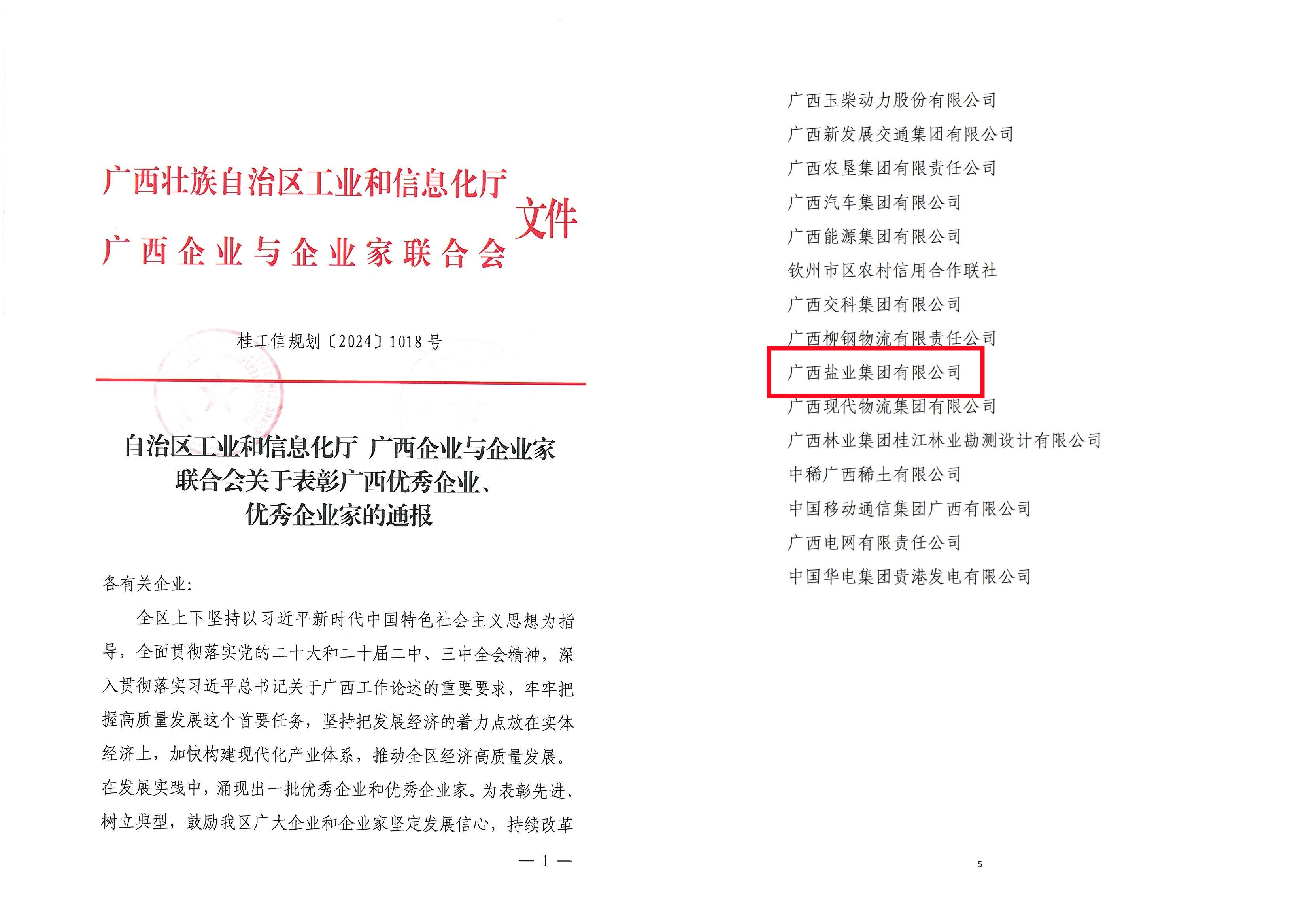 近日,自治區(qū)工業(yè)和信息化廳正式公布2024年廣西優(yōu)秀企業(yè)、優(yōu)秀企業(yè)家評(píng)比表彰結(jié)果。廣西鹽業(yè)集團(tuán)在眾多企業(yè)中脫穎而出,再次獲評(píng)“廣西優(yōu)秀企業(yè)”榮譽(yù)稱號(hào)。